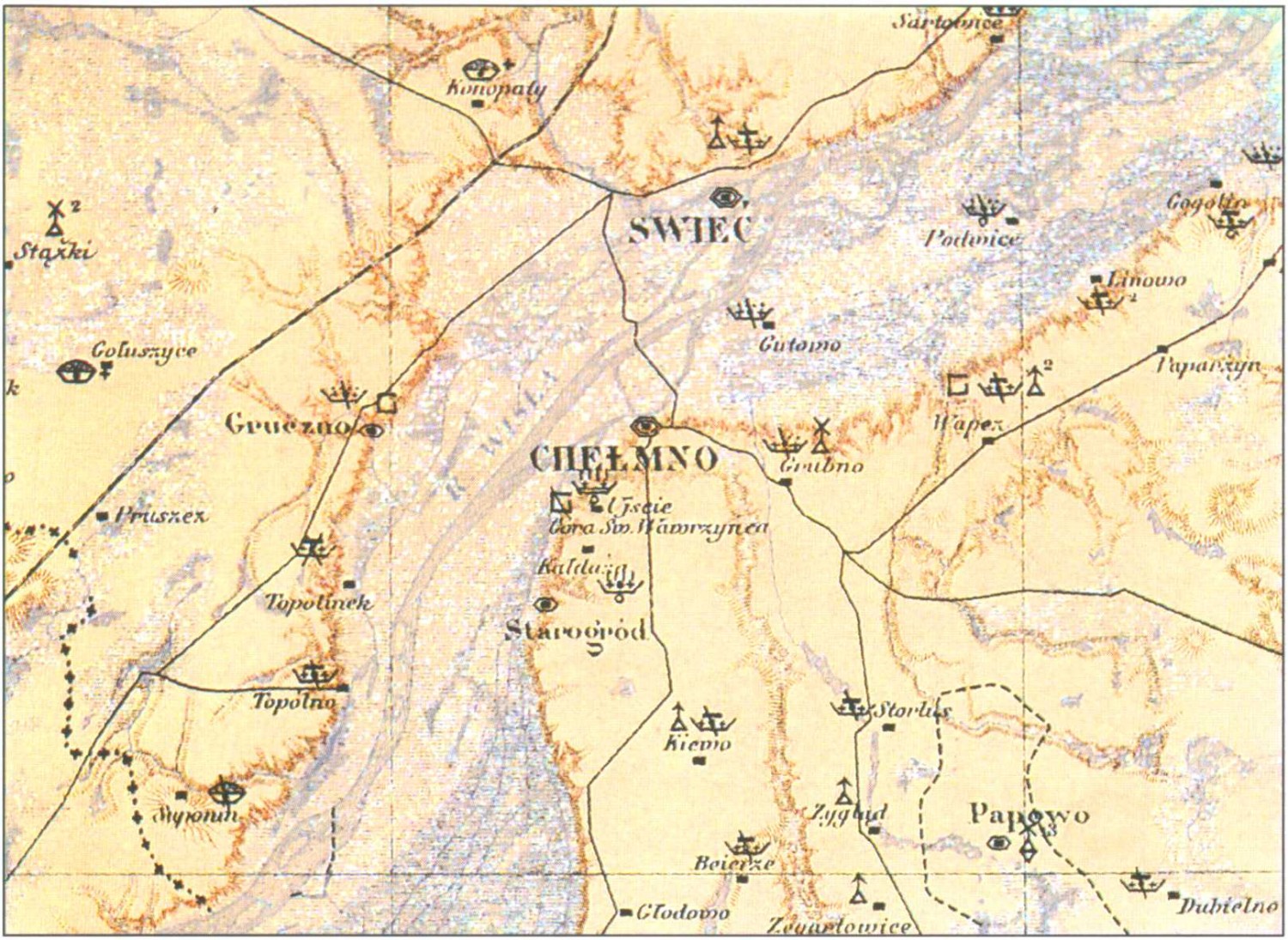 [Ryc. 1]. Fragment „Mapy Archeologicznej Prus Zachodnich (…)”z lokalizacją stanowisk archeologicznych w Kałdusie (wg Ossowski 1880)