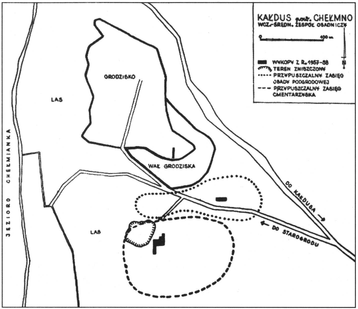 Prace wykopaliskowe w obrębie zespołu osadniczego w Kałdusie wznowiono dopiero po ponad pół wieku [ryc. 9]. Kiedy w 1956 roku w wyniku pogłębionej jesiennej orki zniszczono kilkanaście szkieletów, rozwlekając część kości na znacznym obszarze, ówczesny konserwator zabytków archeologicznych Henryk Wiklak podjął decyzję o przeprowadzeniu w następnym roku badań ratowniczych. Badaniami kierowali Eleonora Byrska–Kaszewska, Jan Kucharski i Henryk Wiklak, a ich podstawowym celem było „zabezpieczenie zabytków wyrzuconych na powierzchnię i zabezpieczenie najbardziej zagrożonych odcinków na cmentarzysku, osadzie i grodzisku” [ryc. 10]. Na tym terenie odkryto 77 grobów wczesnośredniowiecznych (w tym 36 z wyposażeniem) i 27 jam osadniczych z wcześniejszych epok. Materiał źródłowy pochodzący z cmentarzyska stosunkowo szybko został opracowany i opublikowany. Przedmioty znalezione w trakcie badań prowadzonych przez ośrodek łódzki trafiły w latach 70. XX wieku niemal w całości do Muzeum Okręgowym w Toruniu. Kilka przedmiotów pozostało w Muzeum Ziemi Chełmińskiej w Chełmnie. W 1957 roku prowadzono prace archeologiczne na osadzie podgrodowej (stanowisko 2) w odległości około 40 metrów od zewnętrznej podstawy wału, na północ od drogi prowadzącej z Kałdusa na grodzisko, na najwyższym wzniesieniu. Badania objęły powierzchnię czterech ćwiartek arowych. W trakcie tych prac zarejestrowano częściowo zachowaną warstwę kulturową oraz 9 zróżnicowanych jam osadniczych. Równocześnie przy okazji badań terenowych prowadzonych na cmentarzysku i osadzie podgrodowej był wizytowany teren grodziska (stanowiska 3 i 6)., gdzie pierwsze prace o charakterze ratowniczym przeprowadził H. Wiklak w 1958 roku. Wytyczony został wówczas jeden wykop w obrębie gródka (stanowisko 6). Systematyczne badania wykopaliskowe podjęto dopiero w latach 1967–1969 i 1970–1972. Pracami terenowymi kierowali wówczas Andrzej Kola, Wiesława Matuszewska-Kola z Katedry Archeologii Polski i Powszechnej Uniwersytetu Mikołaja Kopernika oraz w latach 1971–1972 pracownik Muzeum w Grudziądzu-Ryszard Boguwolski. Nadzór naukowy nad pracami sprawował Kazimierz Żurowski, Kierownik Katedry Archeologii UMK. W trakcie sześciu sezonów wykopaliskowych przebadano na grodzisku (stanowisko 3) oraz gródku (stanowisko 6) powierzchnię 367 m2 (Kola 1975, s. 17). Łącznie wytyczono dziewięć wykopów, pięć w obrębie gródka oraz cztery na grodzisku, w północnej zachodniej (po jednym) oraz południowo-wschodniej jego części (dwa). W 1992 roku na stanowisku 1, w miejscu dzikiego wybierzyska piasku na wniosek Wojewódzkiego Konserwatora Zabytków przeprowadzono jednodniowe badania ratownicze. Kolejny etap badań zespołu osadniczego w Kałdusie związany jest z działalnością naukowo-badawczą Zakładu Archeologii Średniowiecza i Czasów Nowożytnych, której pracownicy pod kierownictwem Wojciecha Chudziaka rozpoczęli od 1996 roku systematyczne prace wykopaliskowe na grodzisku (stanowisko 3), gródku (stanowisko 6), cmentarzyskach (stanowiska 1 i 4) oraz osadzie podgrodoqwej (stanowisko 2).