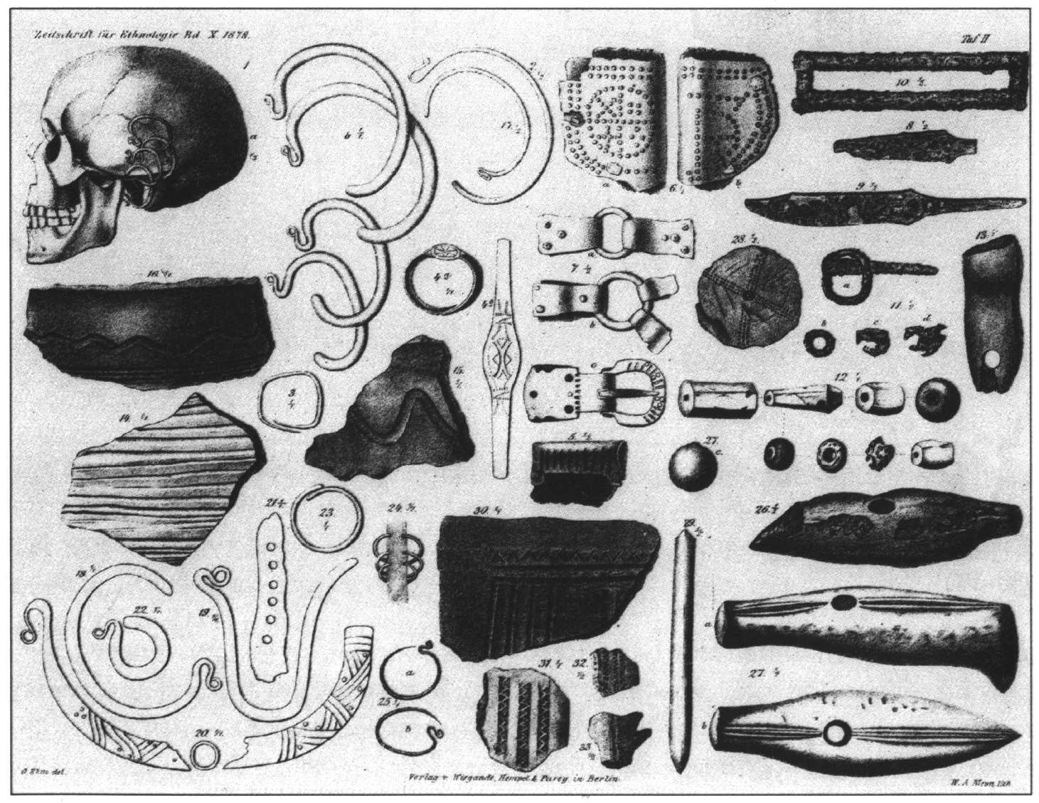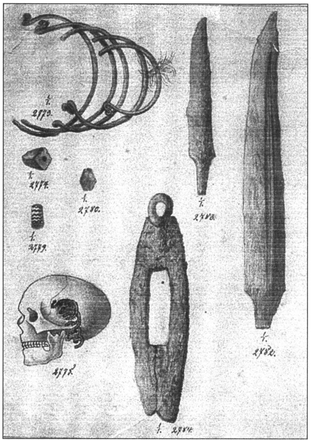 [Ryc. 2]. Kałdus, woj. kujawsko-pomorskie, stanowisko 1. Przedmioty znalezione na terenie cmentarzyska w trakcie badań A. Lissauera (wg Lissauer 1878, tabl. II)