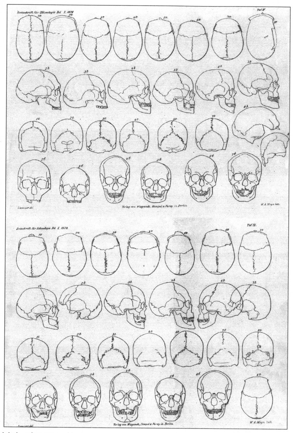 [Ryc. 3]. Kałdus, gm. Chełmno, stanowisko 1. Dokumentacja rysunkowa czaszek z badań A Lissauera (wg Lissauer 1878, tabl. III-IV)