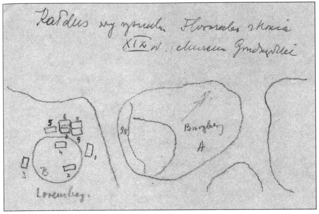 [Ryc. 4]. Kałdus, woj. kujawsko-pomorskie, stanowisko 1. Odręczny rysunek z lokalizacją wykopów K. Florkowskiego (archiwum Działu Archeologii Muzeum Okręgowym w Toruniu)