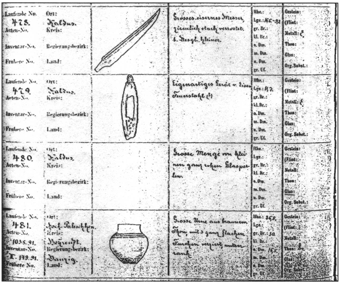 Wydarzenia II wojny światowej spowodowały konieczność ewakuacji z Westpreussische Provinzial – Museum wielu zbiorów muzealnych. Archiwa muzealne, a wraz z nimi prawdopodobnie też dokumentacja z badań A. Lissauera, K. Lakowitza i P. Kumma zostały wywiezione na Żuławy Wiślane i uległy zniszczeniu (Kwapiński 1995, s. 29). Po wielu latach ocalałe przedmioty zebrano w Museum für Vor- und Frühgeschichte w Berlinie – Charlottenburgu [ryc. 7]. Do dnia dzisiejszego znajduje się tam 60 metalowych ozdób i elementów stroju oraz liczne paciorki szklane i kamienne, narzędzia i przedmioty ceramiczne, pochodzące z Kałdusa, z których większość trafiła tam za pośrednictwem nauczyciela z Kałdusa – Dittbrennera. W archiwum Museum für Vor- und Frühgeschichte zachowała się też liczna korespondencja z lat 1891–1920, między kierownictwem tamtejszego Muzeum a Dittbrennerem [ryc. 8ab].