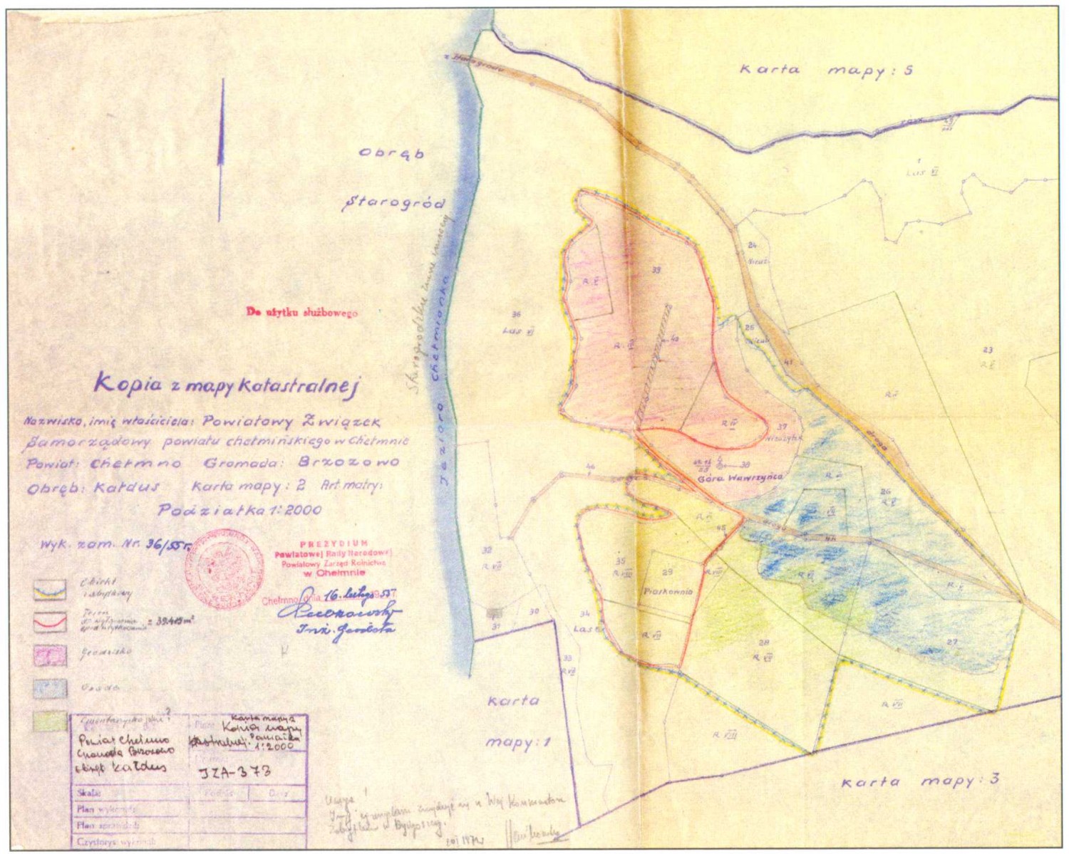 [Ryc. 9]. Mapa katastralna Góry św. Wawrzyńca i terenów przyległych z 1955 r. (archiwum Działu Archeologii Muzeum Okręgowego w Toruniu)